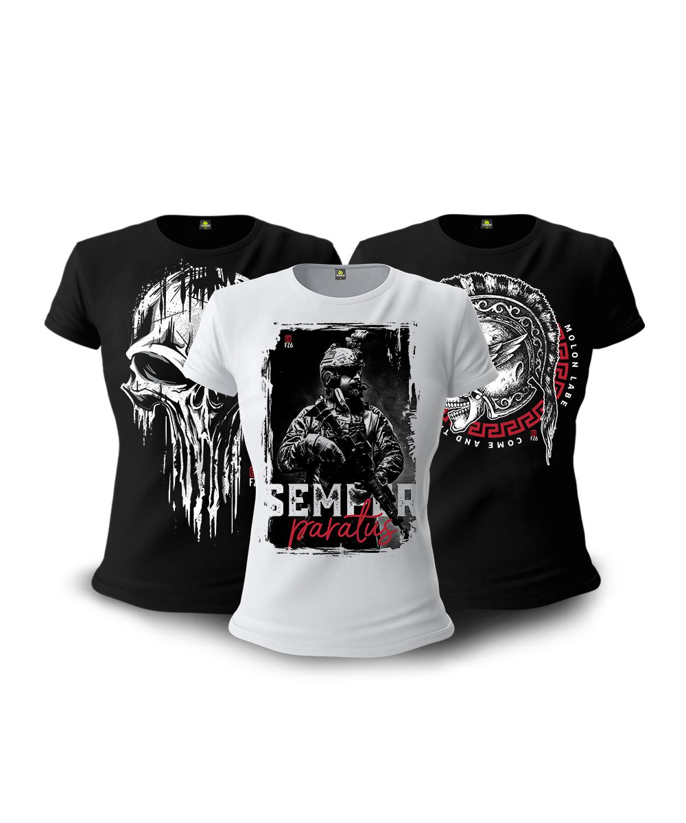 O Kit 03 Camisetas Baby Look Feminina GUFZ6 Paratus é composto por 3 (três) camisetas femininas militares exclusivas, com estampas distintas.